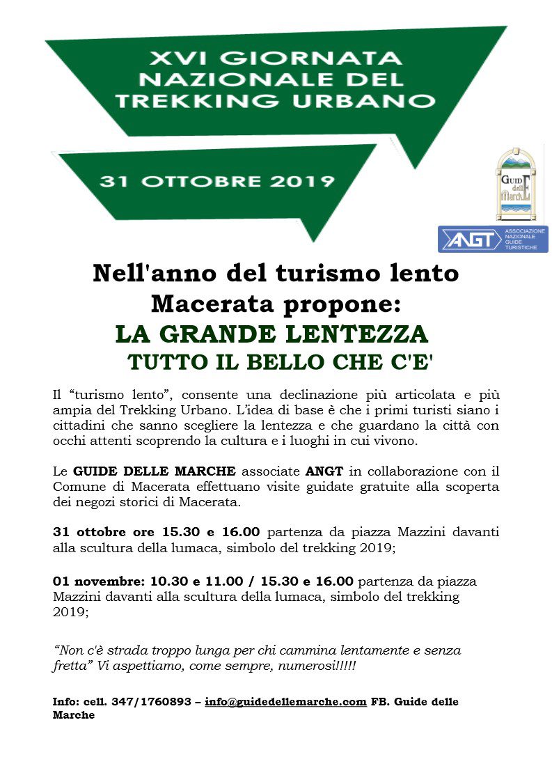 In occasione della 16° edizione del Trekking Urbano Nazionale 2019 le Guide delle Marche effettuano visite guidate gratuite nella città di Macerata con La Grande Lentezza, Tutto il Bello che C’è dal 31 ottobre (15:30 e 16:00 da piazza Mazzini) al 1 novembre 2019 (10:30 e 11:00/15:30 e 16:00 da piazza Mazzini).