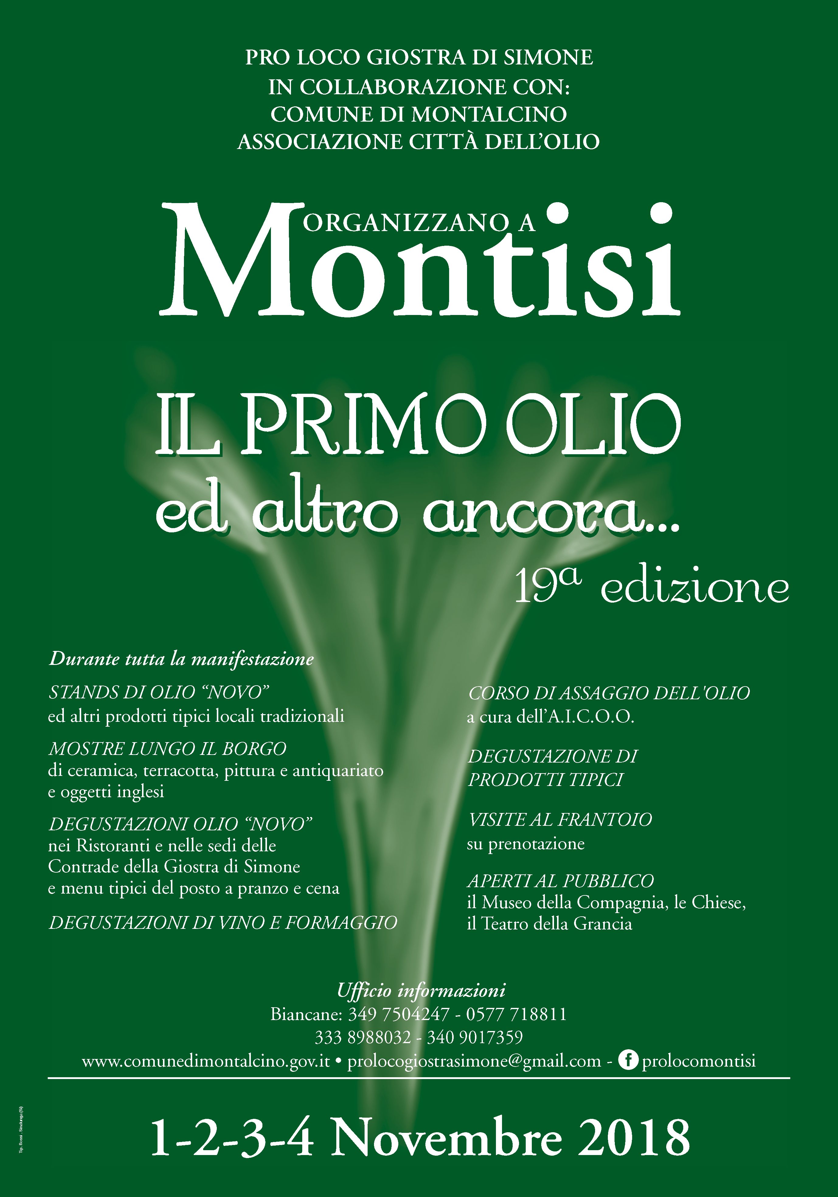 Si tratta di un fine settimana all’insegna della cultura gastronomica dove sarà possibile degustare l’olio di nuovissima spremitura di quest’angolo delle crete senesi accompagnato dagli altri prodotti tipici di questa zona (tartufo bianco delle crete senesi e Vino Doc Orcia)nelle sede delle contrade e nei ristoranti. Sarà possibile fare visite guidate ai frantoi del paese e fare mini corsi di assaggio d’olio e vino miele e formaggi, nonché visite alle contrade della Giostra di Simone, al Museo della Compagnia, al Piccolo Teatrino della Grancia recentemente ristrutturato.