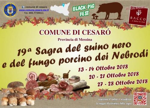 La 19^ Sagra del Suino Nero e del Fungo Porcino dei Nebrodi a Cesarò torna per tre weekend d’autunno: 13 e 14, 20 e 21, 27 e 28 ottobre 2018.