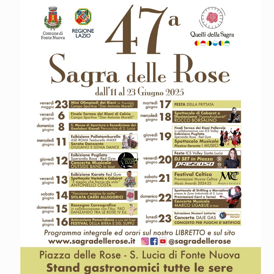 Torna l’attesissimo appuntamento con la Sagra delle Rose, una delle manifestazioni popolari più importanti della provincia; ogni sera si susseguiranno spettacoli folkloristici e comici, sfilata di carri allegorici, sbandieratori, spettacoli musicali.