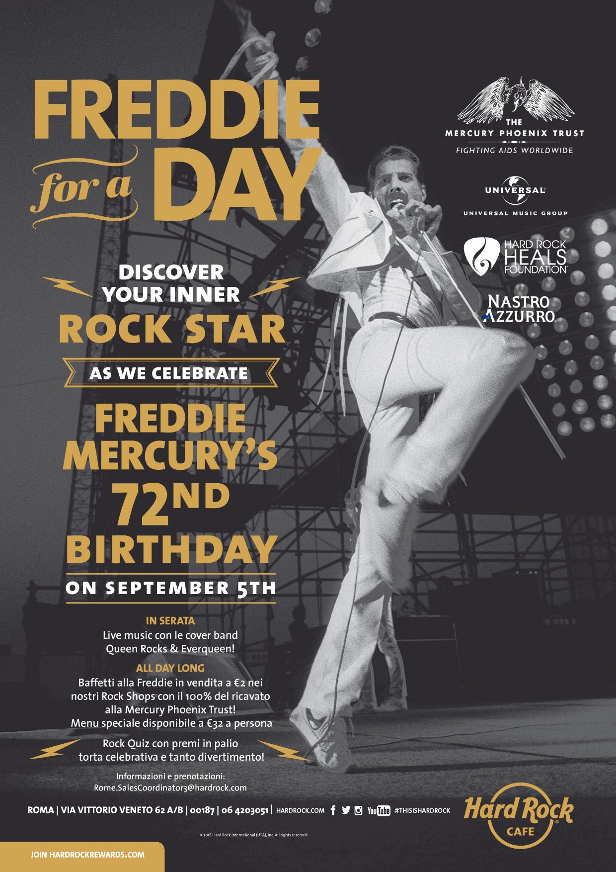 Per la sesta edizione di Freddie for a day, Hard Rock Cafe Roma organizza un’intera giornata di festeggiamenti con musica, concerti live, contest, quiz, menu a tema e soprattutto raccolta fondi a sostegno del Mercury Phoenix Trust per la ricerca contro l’AIDS e l’HIV.