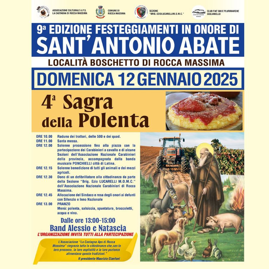 In occasione delle celebrazioni in onore di Sant’Antonio Abate, protettore degli animali, non solo cani e gatti ma anche quelli legati alla tradizione contadina, Rocca Massima organizza una giornata di festa che unisce momenti di raccoglimento religioso e di gioiosa convivialità in concomitanza con la Sagra della Polenta.