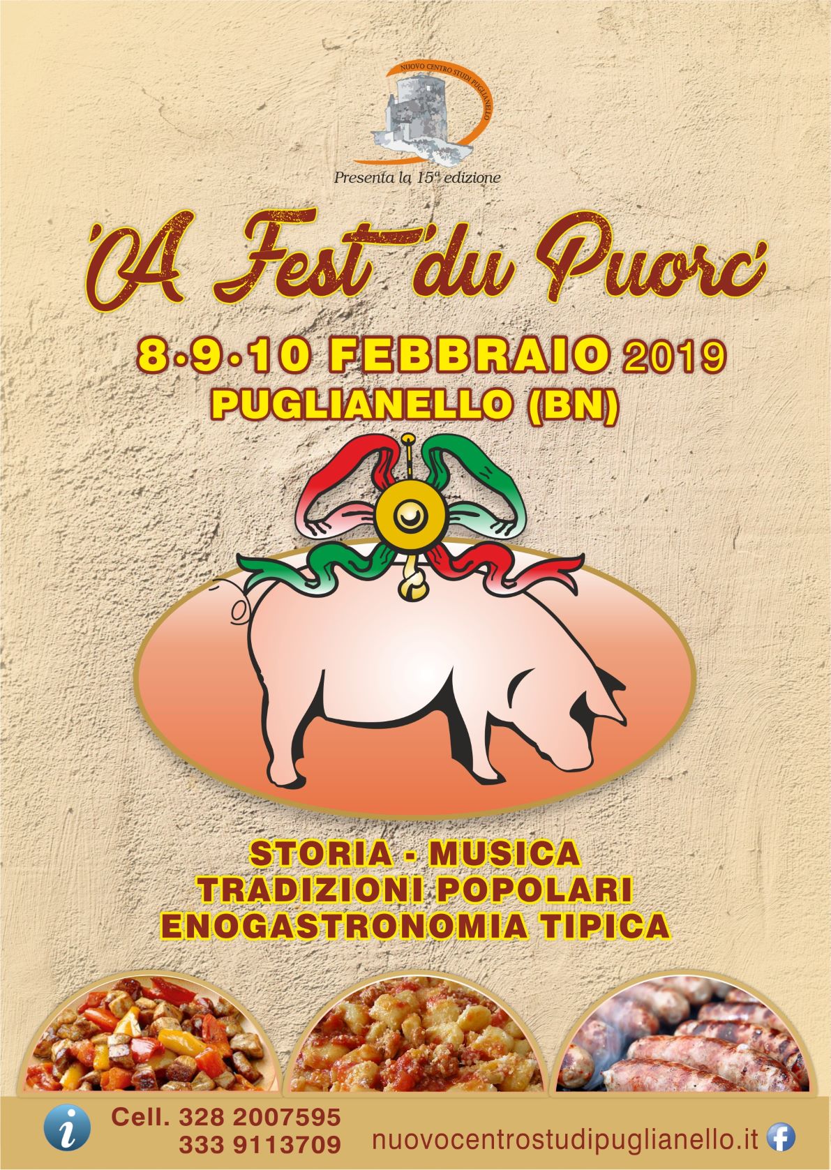 Dall’8 al 10 febbraio 2019 torna a Puglianello (Benevento) l’attesissima A Fest’ du Puorc. La manifestazione, che da alcuni anni registra sempre maggiore attenzione da parte dei tanti cultori dell’enogastronomia, intende valorizzare le tradizioni autentiche del territorio. ‘A Fest’ du Puorc’ (momento in cui il maiale, cresciuto all’interno della famiglia contadina viene ammazzato) rappresenta nella cultura contadina la certezza alimentare, la dispensa del domani, la gioia dell’essere.