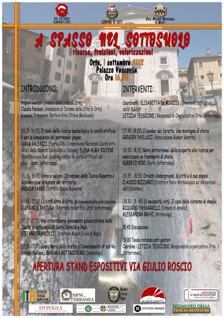 Si alterneranno nella presentazione, coordinati da Elisabetta De Minicis (Università degli Studi della Tuscia) e da Letizia Tessicini (Orte Sotterranea), Carla Galeazzi (Egeria CRS – Commissione Nazionale Cavità Artificiali della Società Speleologica Italiana) ed Elena Volpini (Hypogea Fed. Speleologica per le cavità artificiali del Lazio – Roma Sotterranea), Andrea Sasso (Istituto Tuscia Rupestre), Giancarlo Pastura (Orte Sotterranea), Stefano Francocci (Museo Civico Nepi), Barbara Bottacchiari (Speleologa), Gregory Paolucci (Bunker Soratte), Roberto Nini (Narni Sotterranea), Claudio Bizzarri (Parco Archeologico e Ambientale dell’Orvietano), Riccardo Passagrilli e Alessandra Bravi (Comune di Amelia). Le ricerche illustrate riguardano numerosi contesti umbro-laziali in particolare quelle condotte nelle parti sepolte degli abitati di Orte, Orvieto, Amelia e Narni e presso i complessi di Nepi (Catacombe di Santa Savinilla), del Monte Soratte e degli insediamenti rupestri di San valentino e Santa Maria delle Grotte a Gallese.