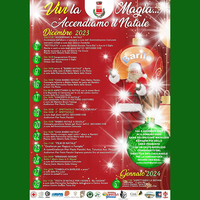 Per un calendario pieno di eventi di tutti i tipi e per tutti i gusti non perderti Accendiamo il Natale di Barile!