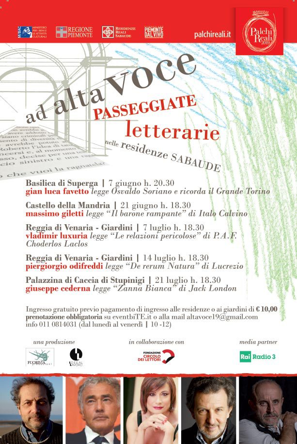 Gian Luca Favetto, Massimo Giletti, Vladimir Luxuria, Piergiorgio Odifreddi e Giuseppe Cederna sono i protagonisti di AD ALTA VOCE, cinque appuntamenti fra giugno e luglio in cui autori e personaggi della scena culturale italiana presteranno la propria voce per la lettura di grandi classici che hanno segnato le loro e le nostre vite e che rivivranno in incontri dinamici, durante i quali scoprire i giardini delle Residenze Reali e in cui alla camminata fisica si unirà un percorso tra pensieri e parole. Un piccolo ma intenso viaggio da fare insieme, a piedi, che permetterà di scoprire con sguardo nuovo le residenze dei Savoia, teatro della raffinata vita di corte, attraverso parole, immagini e profumi. Camminare e ascoltare insieme per riflettere, per immaginare molte domande e forse qualche risposta, mettendo dolcemente in moto i muscoli e alimentando la mente attraverso la bellezza del contesto e delle parole in uno speciale rito laico collettivo. Un’occasione per riscoprire libri straordinari attraverso il punto di vista di chi ha molto amato quel libro, condividendo l’emozione dell’ascolto con altri cultori del genere, in un contesto straordinario e fuori dal comune. Per ogni luogo, la lettura di un libro che a quel luogo è idealmente collegato attraverso fili sottili, assonanze, suggestioni, un libro importante per lo stesso lettore illustre che a quelle parole darà voce.