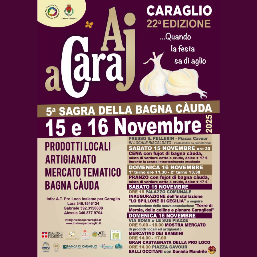 Il 15 e il 16 novembre si terrà a Caraglio la 22° edizione di Aj a Caraj, la manifestazione dedicata all’aglio, prodotto tipico di questa zona organizzata dall’Associazione Turistica Pro Loco Insieme per Caraglio in collaborazione con il Consorzio e la Confraternita dell’Aglio.