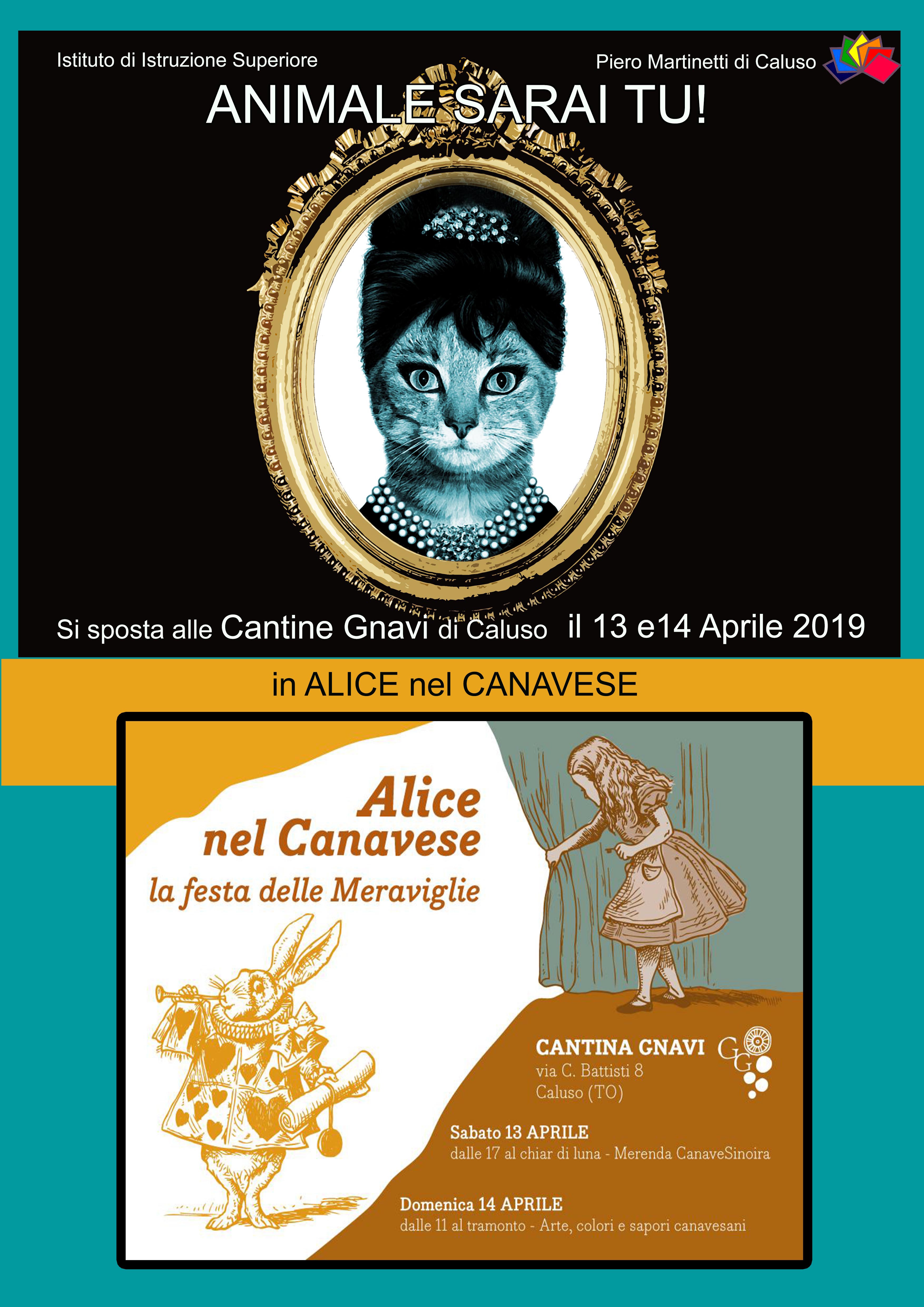 Alice nel Canavese, la festa delle meraviglie di primavera, torna dal 13 al 14 Aprile 2019 presso Cantina Gnavi in via Cesare Battisti, 8 a Caluso (Torino). Inoltre un ospite da favola terrà il vernissage di animali fantastici, Animale Sarai Tu!, opere pittoriche degli studenti di 4°C e 5°C a cura della Prof.ssa G. Catania del Liceo Piero Martinetti di Caluso.