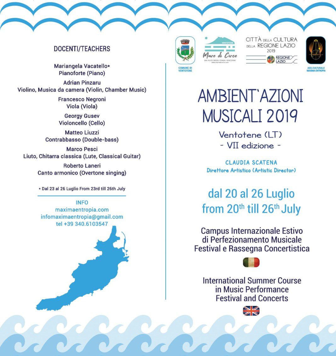 Il Campus Ambient’Azioni Musicali nasce per volontà di un gruppo di giovani musicisti nel 2010, dall’idea di realizzare una sezione tematica incentrata sulla musica colta all’interno del Festival “Ambient’Arti” a Morino (L’Aquila). Per 6 anni le attività del Campus hanno avuto luogo in varie località del territorio aquilano, dando così l’occasione a tanti studenti e docenti provenienti da ogni parte del mondo di partecipare ad un’esperienza didattica ed artistica di altissimo valore culturale. Forte di una significativa esperienza consolidata nell’arco degli anni e della notevole risposta a livello internazionale che ha visto un exploit di adesioni nelle ultime 2 edizioni, il Campus rappresenta ormai un appuntamento tradizionale nell’ambito dei seminari residenziali di perfezionamento e delle manifestazioni estive del centro Italia. Dopo una breve pausa, il Campus vuole riprendere il suo corso nell’estate 2019 e si svolgerà nell’isola di Ventotene (Latina) dal 20 al 26 luglio 2019. E’ previsto lo svolgimento di ben dieci corsi: pianoforte, violino, viola, violoncello, contrabbasso, liuto, chitarra, musica da camera, canto armonico e propedeutica per bambini. Durante la settimana verranno organizzati concerti in diversi punti dell’isola.