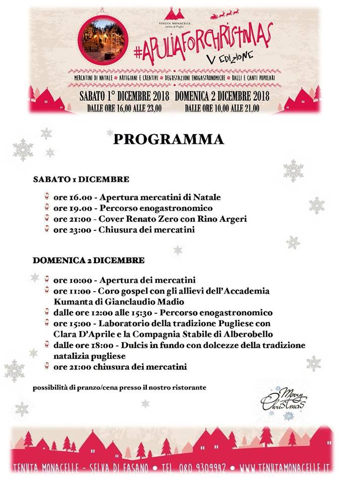 Ritorna come è ormai consuetudine ApuliaForChristmas 2018, uno degli eventi più suggestivi del Natale pugliese, giunto alla sua quinta edizione. I Mercatini di Natale, ospitati presso la Tenuta Monacelle nelle campagne di Monopoli (Bari), andranno in scena i prossimi 1 e 2 dicembre. Quasi 40 espositori tra creativi e artigiani metteranno in mostra le proprie creazioni “hand-made”: un occasione unica per poter anticipare i regali da mettere sotto l’albero! Un ricco programma di degustazioni enogastronomiche allieteranno il palato di grandi e piccini tra caldarroste, vino, pettole e molte altre prelibatezze, il tutto in uno scenario unico come solo quello il borgo storico dei trulli può regalare. Completano la programmazione spettacoli live, canti e balli popolari.