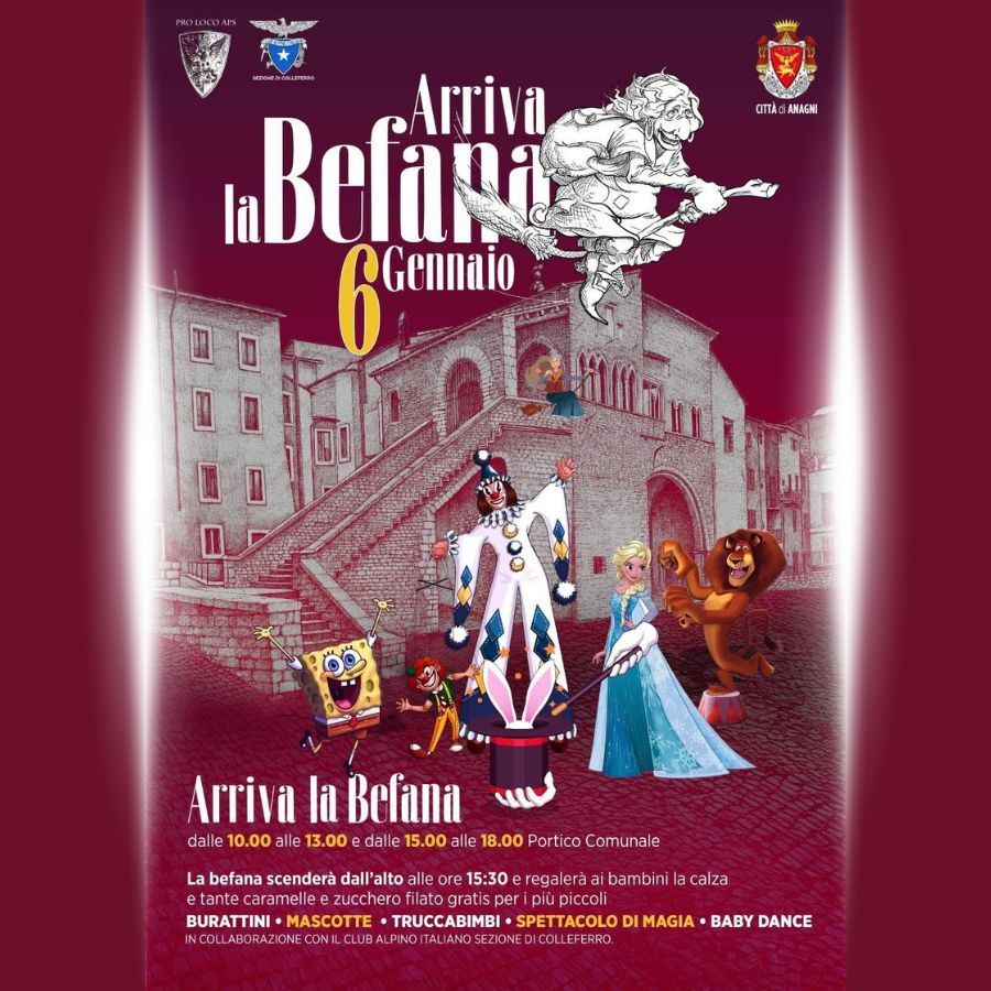 La Befana vi aspetta lunedi 6 gennaio 2025 sotto al portico comunale per visitare il Villaggio della Befana e ricevere in dono una calza piena di dolcetti.