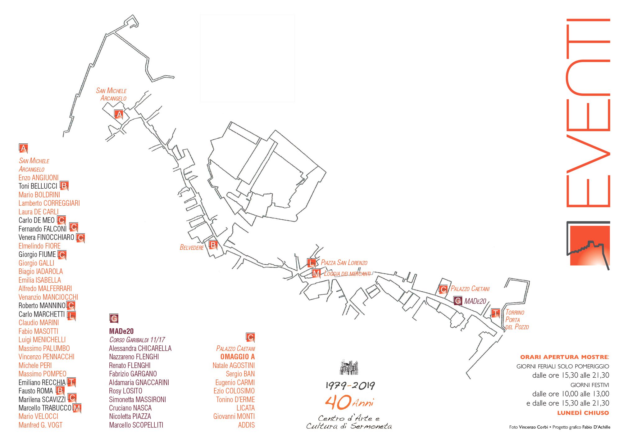 Dal 1 al 30 giugno 2019 il Comune di Sermoneta, il Centro d’Arte e Cultura di Sermoneta, MAD Museo d’Arte Diffusa e la Pro Loco presentano Eventi 2019 – Arte contemporanea a Sermoneta. L’ottava edizione, a cura di Vincenzo Scozzarella con la collaborazione di Angela Calvani, Fabio D’Achille, Fernando Falconi, Antonio Fontana e Lydia Palumbo Scalzi, prevede un programma ricco e articolato. In mostra, diffuse nel paese, le opere di Enzo Angiuoni, Toni Bellucci, Mario Boldrini, Lamberto Correggiari, Laura De Carli, Carlo De Meo, Fernando Falconi, Venera Finocchiaro, Ermelindo Fiore, Giorgio Fiume, Giorgio Galli, Biagio Iadarola, Emilia Isabella, Alfredo Malferrari, Venanzio Manciocchi, Roberto Mannino, Carlo Marchetti, Claudio Marini, Fabio Masotti, Luigi Menichelli, Massimo Palumbo, Vincenzo Pennacchi, Michele Peri, Massimo Pompeo, Emiliano Recchia, Fausto Roma, Marilena Scavizzi, Marcello Trabucco, Mario Velocci, Manfred G. Vogt. A Palazzo Caetani, omaggi a Addis, Natale Agostini, Sergio Ban, Eugenio Carmi, Ezio Colosimo, Tonino D’Erme, Licata, Giovanni Monti.