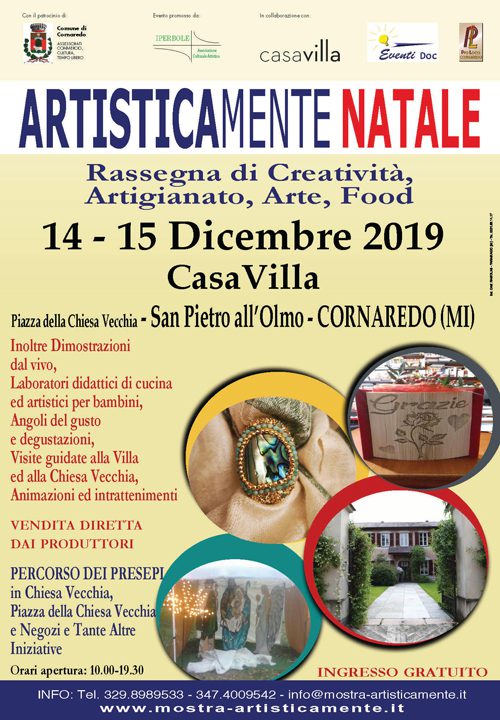 Anche nel mese di dicembre l’Associazione Culturale e Artistica Iperbole ed Eventi doc di Myriam Vallegra proseguono il loro impegno nella promozione e nella valorizzazione del patrimonio artistico e culturale italiano con la manifestazione Artisticamente Natale in programma nell’antica dimora di CasaVilla, una perla di cultura e di arte situata a San Pietro all’Olmo nei pressi di Cornaredo, alle porte di Milano. Per due giorni l’antica dimora originaria del 1400 ospiterà nelle giornate di sabato 14 e domenica 15 dicembre 2019 una kermesse tutta dedicata all’artigianato artistico, alla creatività, all’arte, al Fatto a Mano, al Made in Italy, alla qualità ed al gusto sia in termini di buon cibo sia dal punto di vista estetico. La manifestazione sarà patrocinata dal Comune di Cornaredo ed organizzata in collaborazione con il Comune stesso, Casa Villa, Proloco, i commercianti ed altre realtà associative ed imprenditoriali. Artisticamente Natale in CasaVilla proporrà l’esposizione e la vendita di numerosi prodotti particolari ed originali di artigianato artistico, dai libri intagliati a mano alle decorazioni natalizie per casa e tavola, dai capi e gli accessori moda originali agli arredi e le soluzioni per la casa, dai prodotti enogastronomici selezionati da diverse Regioni Italiane alle degustazioni guidate gratuite. Ad Artisticamente Natale si approfondiranno inoltre particolari tecniche di lavorazione artigianale e si trovano idee moda, accessori moda, gioielli e bijoux, libri ed anche mobili e complementi per la casa, la tavola ed i regali.