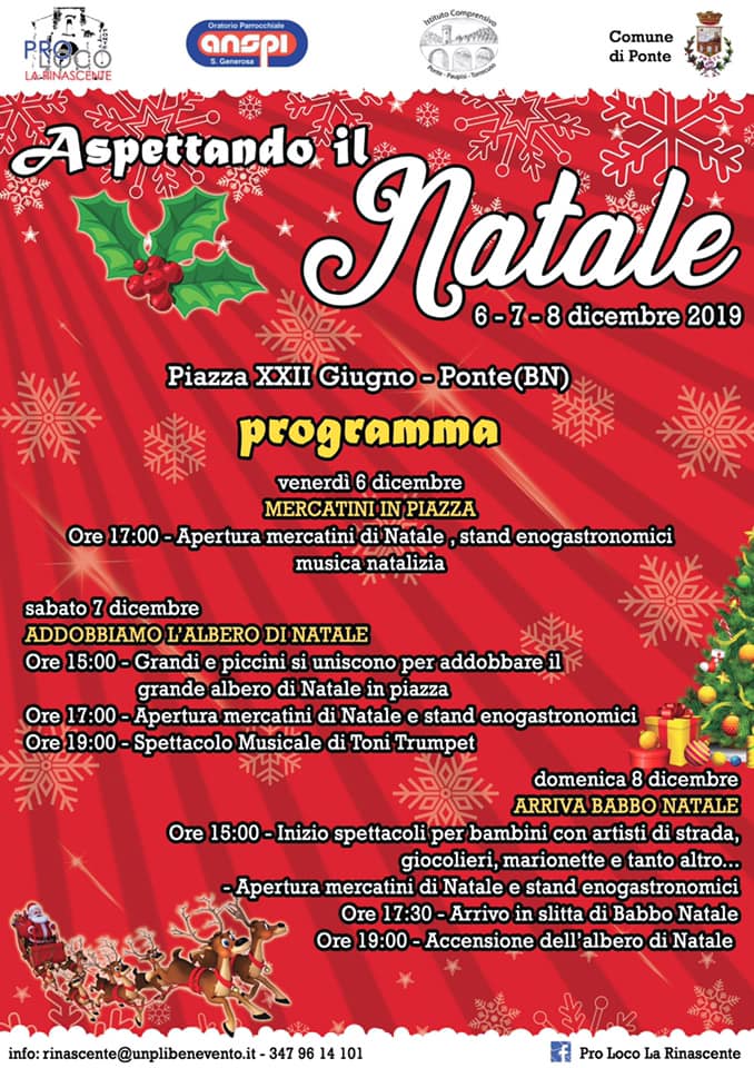 Aspettando il Natale è l’evento organizzato a Ponte (Benevento) dalla Pro Loco La Rinascente in programma nei giorni dal 6 all’8 dicembre 2019 presso la piazza XXII Giugno. In attesa delle festività natalizie sarà possibile trascorrere tre giornate circondati nel calore dell’atmosfera natalizia con suoni, musiche e piatti tipici che caratterizzano tale ricorrenza: cardone, zeppole dolci e salate, castagne, peperoni ripieni, fagioli e tanto altro. Tale atmosfera sarà inoltre contornata dai mercatini natalizi, dall’accensione del grande albero di Natale al centro della piazza, dai tanti artisti che si esibiranno nelle tre serate tra i quali Toni Trampet, i saltimbanchi, zampognari. I bambini potranno inoltre consegnare le loro letterine presso la Casa di Babbo Natale ed attenderlo nel suo arrivo in slitta.