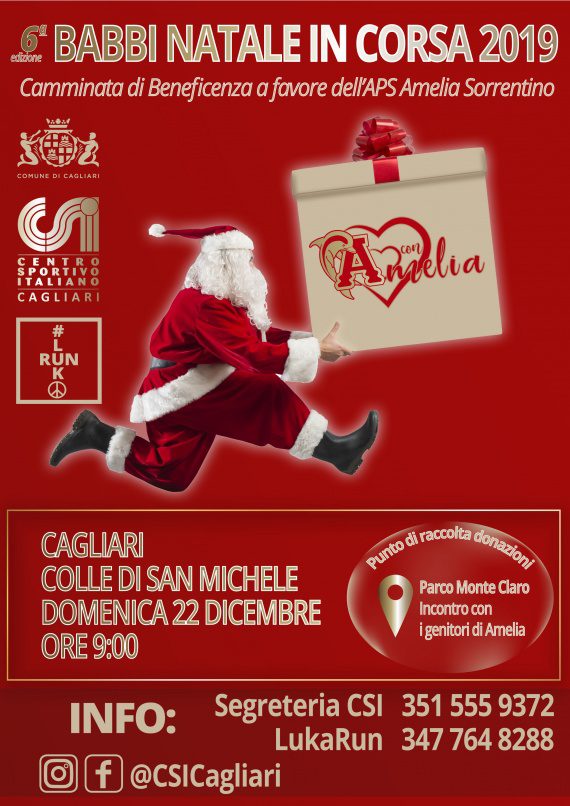 Domenica 22 dicembre 2019 a Cagliari si svolgerà la 6° edizione di Babbi Natale In Corsa, la camminata di beneficenza finalizzata alla raccolta fondi in favore dell’Associazione Amelia Sorrentino APS organizzata dal Centro Sportivo Italiano Cagliari in collaborazione con Lukarun. La camminata veloce non competitiva si svolgerà su un percorso cittadino di circa sei chilometri: punto di ritrovo, di partenza e di arrivo sarà il Parco del Colle di San Michele con sosta per le donazioni al Parco di Monte Claro. La partecipazione- libera e gratuita – è aperta a tutti: adulti, bambini, sportivi e non sportivi. Unico requisito richiesto è indossare l’abito di Babbo Natale, dal più tradizionale al più originale.