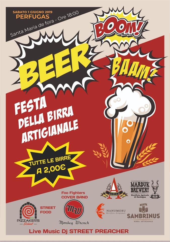 Beer Boom Baam è la rassegna delle birre artigianali di Perfugas (Sassari). L’edizione 2019 si terrà sabato 1° giugno 2019 nel piazzale dell’incantevole Chiesa di Santa Maria de Fora in cui, a partire dalle 17:00, sarà possibile assaggiare le produzioni di birrifici artigianali sardi e di altre regioni d’Italia. La manifestazione vedrà partecipare 4 birrifici al top della selezione birristica, 3 dei quali sardi (Marduk, Sambrinus e Nanumoru) ed 1 di Treviso (Acelum). Non mancherà lo street food con la partecipazione speciale degli artisti della pizza di Pizzaker School. Sul palc il dj Internazionale “Street Preacher” direttamente dalla Groenlandia con i suoi ritmi fusion farà da apripista a questa magnifica giornata, proseguiranno sul palco i Monkey Wrench, cover band dei Foo Fighters.