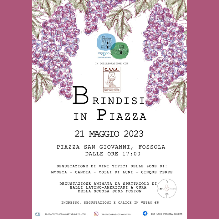 Vi aspettiamo domenica 21 maggio 2023 dalle ore 17:00 in piazza San Giovanni a Fossola per “Brindisi in Piazza“. Degustazione di vini a cura di CAVA – Compagnia Amici del Vino ApuoLunensi accompagnata da animazione di ballo latino americano con la scuola Soul Fusion.