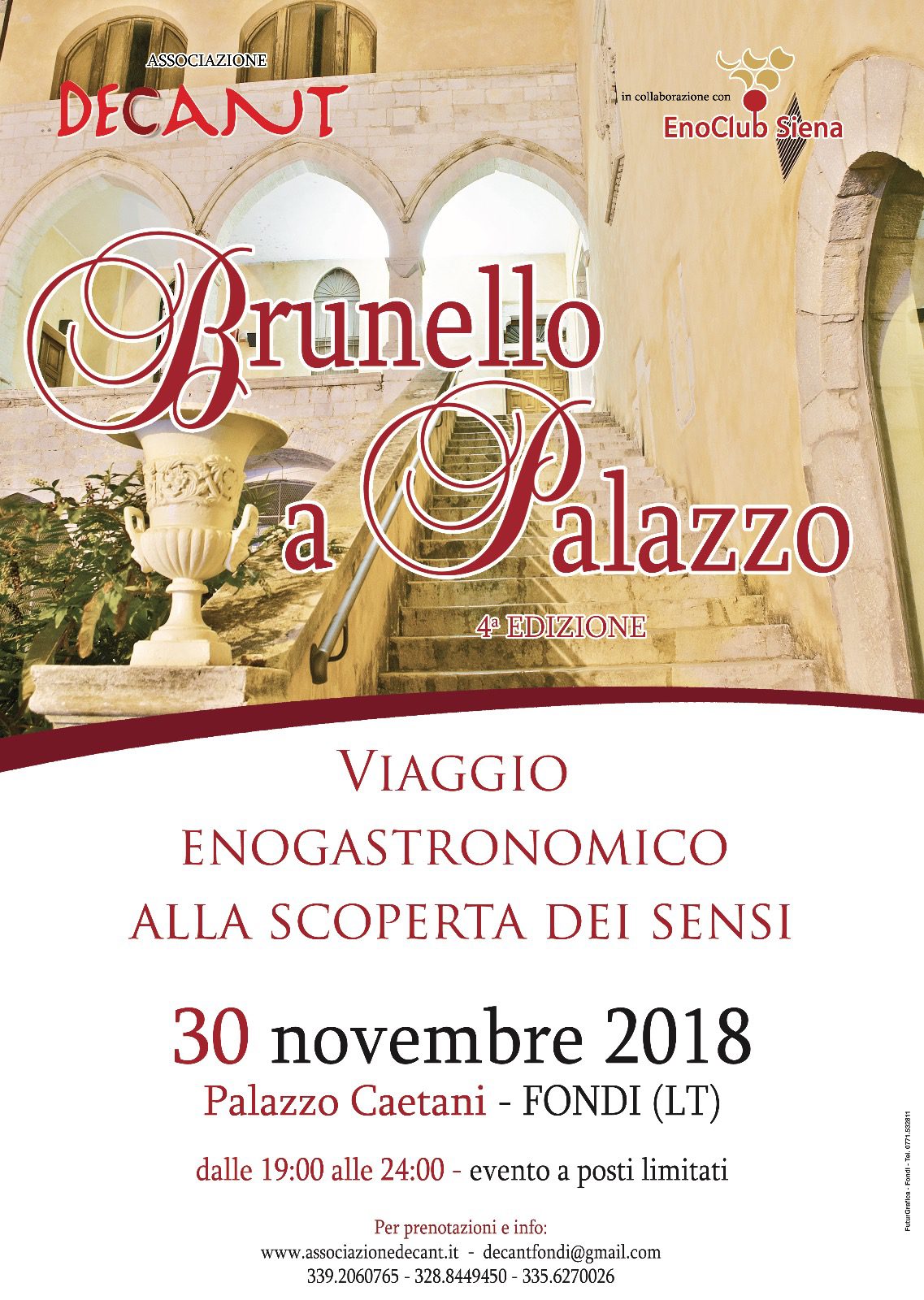 Si svolgerà a Fondi (LT), venerdì 30 novembre 2018, la quarta edizione del percorso enogastronomico dedicato al Brunello di Montalcino ideato e curato da Associazione Decant in collaborazione con EnoClub Siena. La manifestazione avrà luogo all’interno delle prestigiose stanze del Palazzo Caetani, nel cuore della città, dove le numerose etichette di Brunello di Montalcino in degustazione durante la serata saranno accompagnate da piatti e prodotti della gastronomia locale.