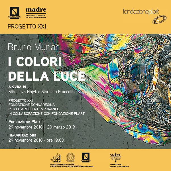 La Fondazione Plart e la Fondazione Donnaregina per le arti contemporanee presentano la mostra BRUNO MUNARI. I colori della luce, a cura di Miroslava Hajek e Marcello Francolini, realizzata presso il Museo Plart di Napoli. L’esposizione analizza un aspetto in particolare e uno specifico corpo di lavori di Bruno Munari, le Proiezioni a luce fissa e le Proiezioni a luce polarizzata realizzate negli anni Cinquanta, con cui porta a compimento la sua ricerca volta a conquistare una nuova spazialità oltre la realtà bidimensionale dell’opera. L’artista, esplorando la nozione di dipingere con la luce, arriva dapprima, nel 1950, al processo di smaterializzazione dell’arte attraverso l’uso di proiezioni di diapositive intitolate Proiezioni Dirette: composizioni con materiali organici, pellicole trasparenti e colorate in plastica, pittura, retini, fili di cotone fermati fra due vetrini. Questi piccoli collage erano proiettati al chiuso e all’aperto, sulle facciate di edifici, dando una sensazione di monumentalità e conquista di un’inedita spazialità, tridimensionale e pervasiva, dell’opera.