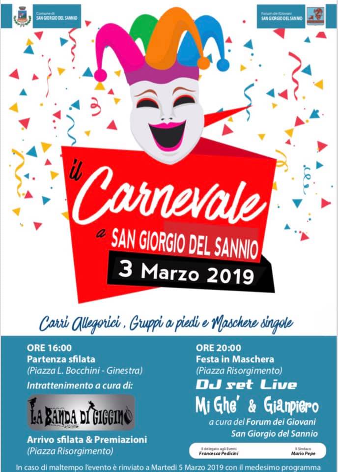 Domenica 3 marzo 2019 in provincia di Benevento si rinnova l’appuntamento con il tradizionale Carnevale di San Giorgio del Sannio. Alle ore 16:00 avrà inizio la sfilata dei carri e delle maschere lungo le vie del paese con partenza da piazza L. Bocchini, arricchita da musica, giochi e premiazioni all’arrivo in piazza Risorgimento. Qui alle ore 20:00 si terrà una grande festa in maschera con Dj Set Live a cura del locale Forum Giovani. In caso di maltempo l’evento sarà rinviato al 5 marzo.