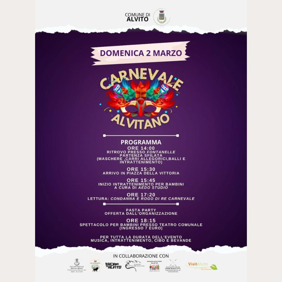 Domenica 2 marzo 2025, Alvito (FR) celebra il Carnevale Alvitano con una giornata ricca di eventi. Dalle ore 14:00, si parte con la sfilata di maschere e carri allegorici per arrivare in Piazza della Vittoria, dove si terranno intrattenimenti per bambini, letture e un pasta party offerto dall’organizzazione