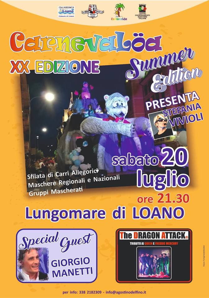 A Loano (Savona) è tutto pronto per la 20° edizione del Carnevalöa Summer Edition, la manifestazione organizzata dall’Associazione Vecchia Loano con il patrocinio ed il contributo dell’Assessorato al Turismo, Cultura e Sport del Comune di Loano. Nella giornata di sabato 20 luglio 2019, a partire dalle 21:30, su corso Roma torneranno a sfilare i carri che questo inverno hanno dato vita alla 28° edizione del Carnevalöa. La sfilata sarà accompagnata da musica, balli, coriandoli e gruppi in maschera. Ad aprire la sfilata dei carri sarà la banda dell’Associazione Musicale Santa Maria Immacolata di Loano, seguita dal tradizionale Carro della Torre dell’Orologio e di Palazzo Doria con a bordo la maschera ligure Capitan Fracassa e le maschere loanesi U Beciancìn, Re del Carnevale e maschera ufficiale del Carnevalöa, U Puè Peppin, maschera tradizionale del carnevale di Loano e la Principessa Doria del Castello (la cui interprete è stata eletta la scorsa estate durante il concorso di Miss Riviera delle Palme, organizzato sempre da Vecchia Loano).