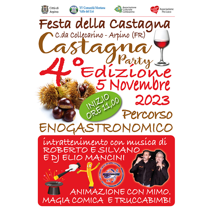 Al Castagna Party, nel suggestivo angolo di Colle Carino, tra castagne e un buon vino, troverai stand gastronomici, intrattenimento musicale, tradizione, tanto divertimento e attività tutte da scoprire!