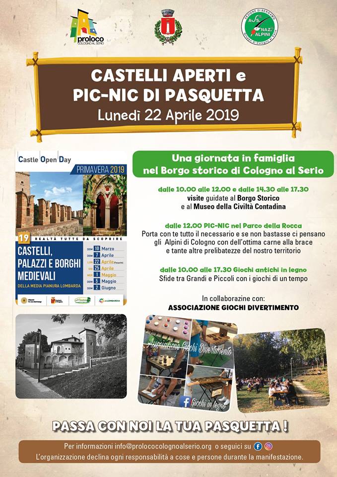 Dopo il grande successo dello scorso anno, torna l’imperdibile evento di Pasquetta organizzato dalla Proloco di Cologno al Serio (Bergamo). Nella giornata tradizionalmente dedicata alla “gita fuori porta” si alterneranno diverse iniziative per grandi e piccoli: grazie a Castelli Aperti la Rocca di Cologno tornerà ad aprire le sue porte per mostrare ai visitatori le sale ricche di storia e affreschi. Le visite si estenderanno anche al borgo, cinto dal fossato medievale, e al Museo della Civiltà Contadina (orario visite 10:00, 11:00. 14:30, 15:30, 16:30, 17:30 – costo 3€, gratis per bambini sotto i 12 anni). Dalle 12:00 l’ampio e verde Parco della Rocca, nel cuore del centro storico, ospiterà il tradizionale pic-nic di Pasquetta con possibilità di portare cibo autonomamente oppure lasciarsi deliziare dalle prelibatezze alla griglia preparate dagli Alpini di Cologno. Per tutta la giornata saranno presenti i giochi in legno che accenderanno la sfida tra grandi e piccini!