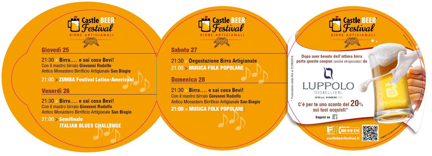 Castle Beer Festival – in programma dal 25 al 28 luglio 2019 in provincia di Potenza – è un evento di puro svago e divertimento dove buona birra, street food e musica faranno trascorrere serate gustose. A Castel Lagopesole, frazione del comune di Avigliano, sarà possibile gustare birre nazionali e estere senza dimenticare le migliori birre artigianali. Per accompagnare la birra sarà disponibile street food di mare e montagna, cibi veloci perfetti da abbinare. Non mancheranno i prodotti tipici lucani mentre tutte le serate saranno accompagnate da concerti e musica. Oltre all’esposizione e vendita di birre artigianali sarà allestita un’area didattica in collaborazione con UnionBirrai, SlowFood Basilicata e alcuni noti maestri birrai che terranno seminari sulla produzione e laboratori di degustazione. Inoltre grazie al patrocinio della Compagnia Toscana Sigari saranno previste anche degustazioni ed abbinamenti tra birre e sigari.