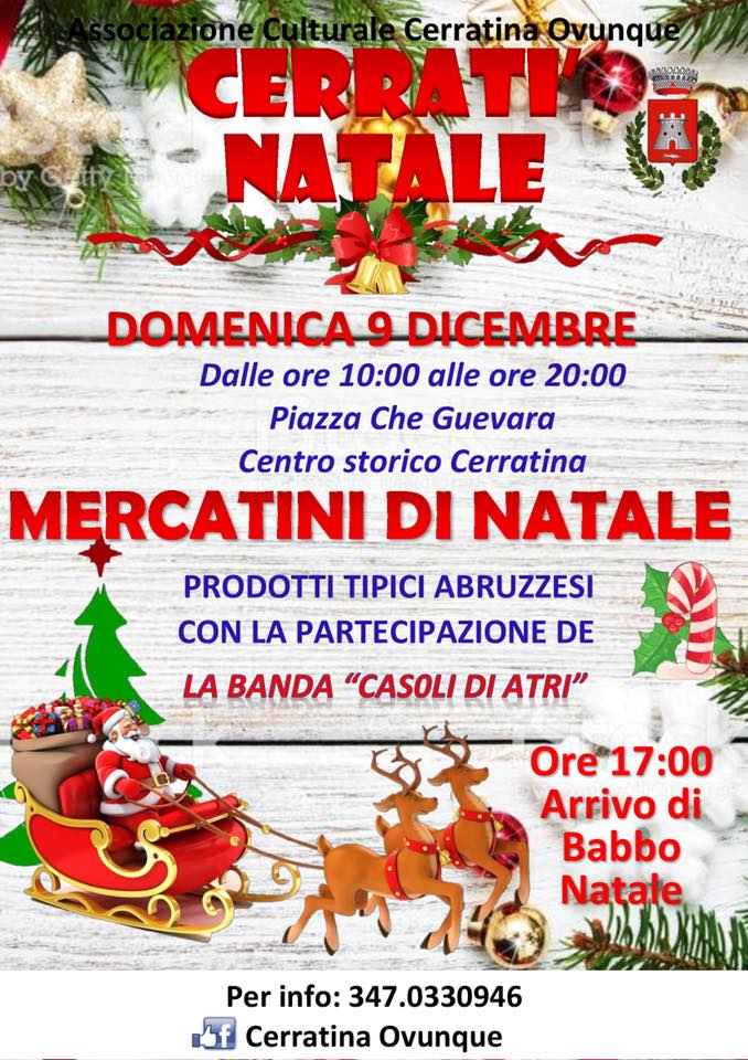 Il 9 dicembre il centro storico di Cerratina, ridente frazione del comune di Pianella (Pescara), ospiterà la seconda edizione dei Mercatini di Natale. Animazione e intrattenimento, truccabimbi, elfi magici, Casetta di Babbo Natale, zampognari, Marino Folk & Friend, Babbo Natale in Carrozza, castagne e vin Brûlè gli ingredienti di questa bella manifestazione natalizia.