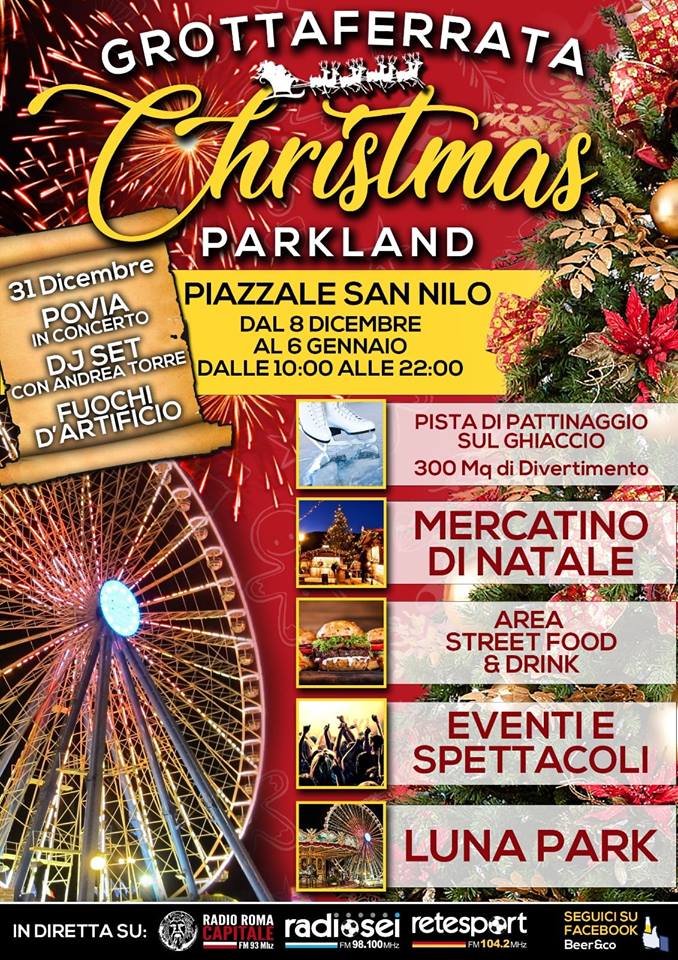 Dall’8 dicembre al 6 gennaio 2019 il Natale va in scena a Grottaferrata (Roma)! In programma, nella suggestiva cornice di piazzale San Nilo, una pista di pattinaggio di 300 mq, 40 casette di legno dove poter trovare occasioni per i regali natalizi degustando ottimi dolci e specialità dei Castelli Romani e un vero Luna Park con ben 20 attrazioni, fra cui giostre e divertimenti per grandi e piccini. Per l’occasione verrà allestito anche un palco dove ogni sera ci sarà da divertirsi tra comici e gruppi musicali. E per la notte di fine anno, il 31 dicembre gran concerto di Povia, spettacoli pirotecnici e musica con il DJ Andrea Torre.