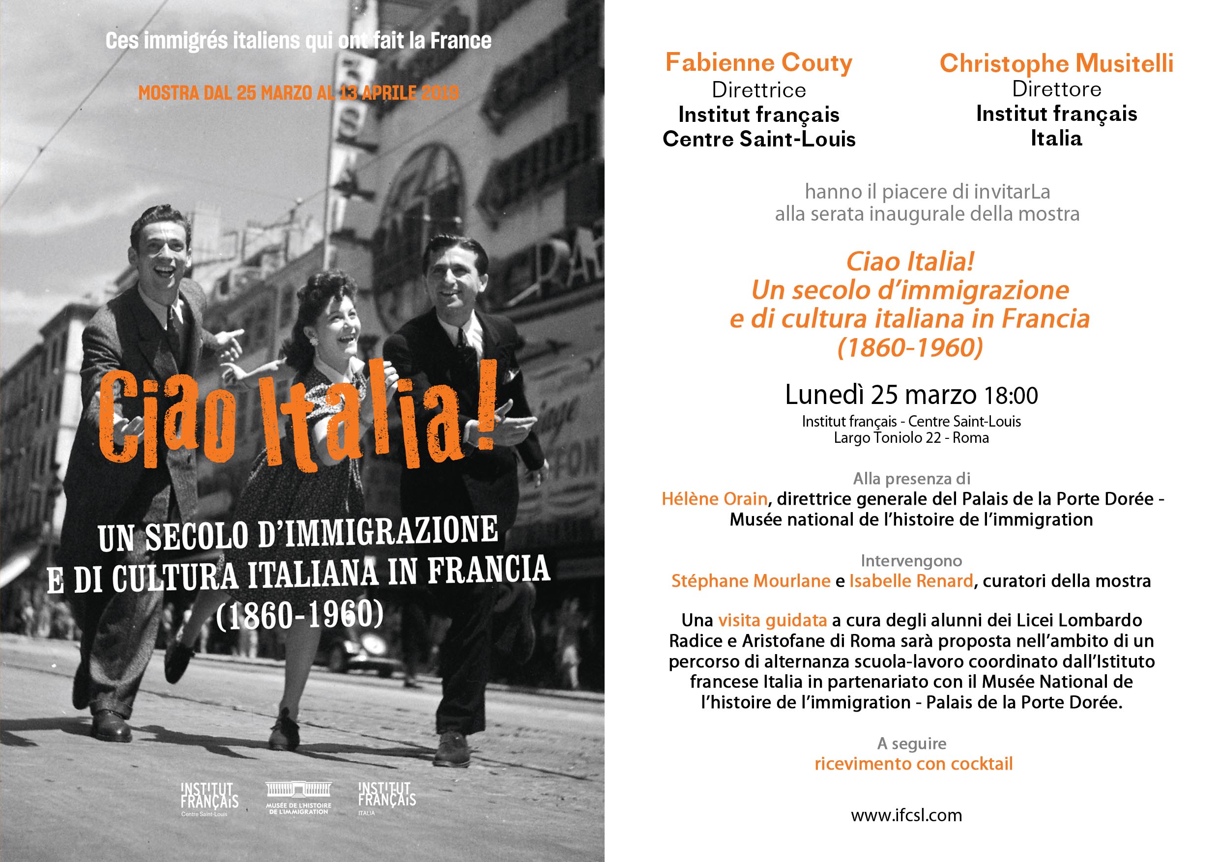 Ciao Italia! è una mostra dal 25 marzo al 13 aprile 2019 a Roma che racconta un secolo d’immigrazione e di cultura italiane in Francia (1860-1960) ideata e realizzata dal Musée National de l’histoire de l’immigration di Parigi nel 2017, propone un itinerario geografico, socio-economico e culturale degli immigrati italiani in Francia dal Risorgimento degli anni 1860 a 1960. “Ciao” parte di quelle parole che accompagnando le migrazioni di milioni d’italiani in tutto il mondo, sono state adottate dalle lingue dei paesi di accoglienza, come in Francia dove ormai fa parte del vocabolario corrente.