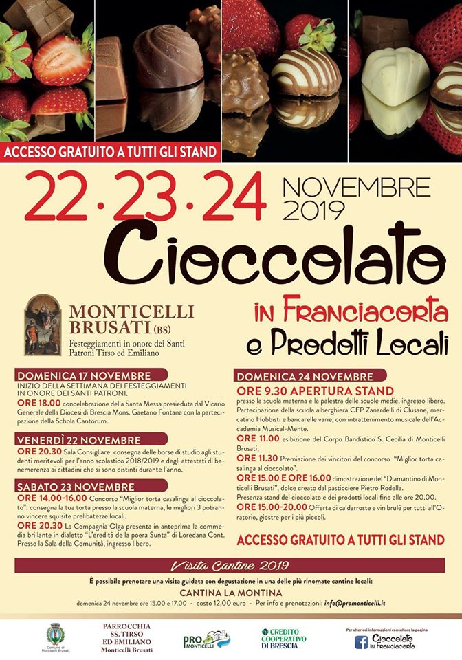 Dal 22 al 24 novembre 2019, Monticelli Brusati (Brescia) ospiterà l’evento Cioccolato in Franciacorta e Prodotti Locali, in occasione dei festeggiamenti dei Santi Patroni del paese. L’accesso sarà gratuito a tutti gli stand.