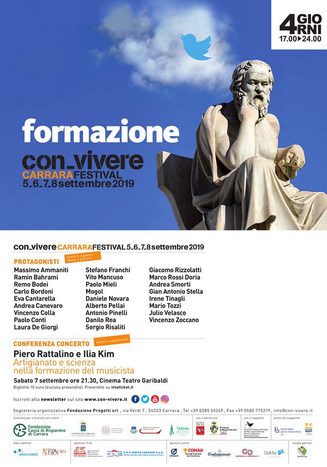 Da giovedì 5 a domenica 8 settembre 2019 a Carrara torna Con_vivere, il Festival sotto la direzione scientifica di Remo Bodei che quest’anno si occuperà di Formazione. Quasi 90 appuntamenti e 30 protagonisti fra lezioni magistrali, mostre, concerti, spettacoli, menu a tema, film e spazio bambini per mettere a fuoco questioni, modelli, parole chiave e capire cosa vuol dire oggi educare, istruire, formare. Piazze, cortili e sale prestigiose degli Enti del territorio ospiteranno oltre 20 conferenze e dibattiti in cui nomi autorevoli del pensiero, giornalisti, scienziati e personalità del mondo culturale si confronteranno con il pubblico. Remo Bodei, Paolo Mieli, Gian Antonio Stella, Julio Velasco, Mario Tozzi, Mogol, Carlo Bordoni, Daniele Novara, Alberto Pellai, Massimo Ammanniti, Paolo Conti, Giacomo Rizzolati, Eva Cantarella, Laura De Giorgi, Antonio Pinelli, Vito Mancuso, Vincenzo Zoccano, Andrea Caneravo,Marco Rossi Doria, Stefano Franchi,Vincenzo Colla, Andrea Smorti. E ancora Danilo Rea e Rahmin Bahrami si alterneranno nella quattro giorni di Festival giunto alla 14° edizione. Appuntamenti tutti gratuiti. Unico evento a pagamento la conferenza-concerto di Ilia Kim e Piero Rattalino in “Artigianato e scienza nella formazione del musicista”.