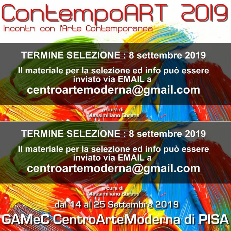 Si inaugura sabato 14 settembre 2019 alle ore 18:30 presso gli spazi espositivi della Galleria d’Arte Moderna e Contemporanea CentroArteModerna di Pisa, a cura di Massimiliano Sbrana, sul lungarno Mediceo, 26, la 25° edizione di ContempoART – Incontri con l’Arte Contemporanea. La mostra proseguirà fino al 25 settembre 2019 a ingresso libero.