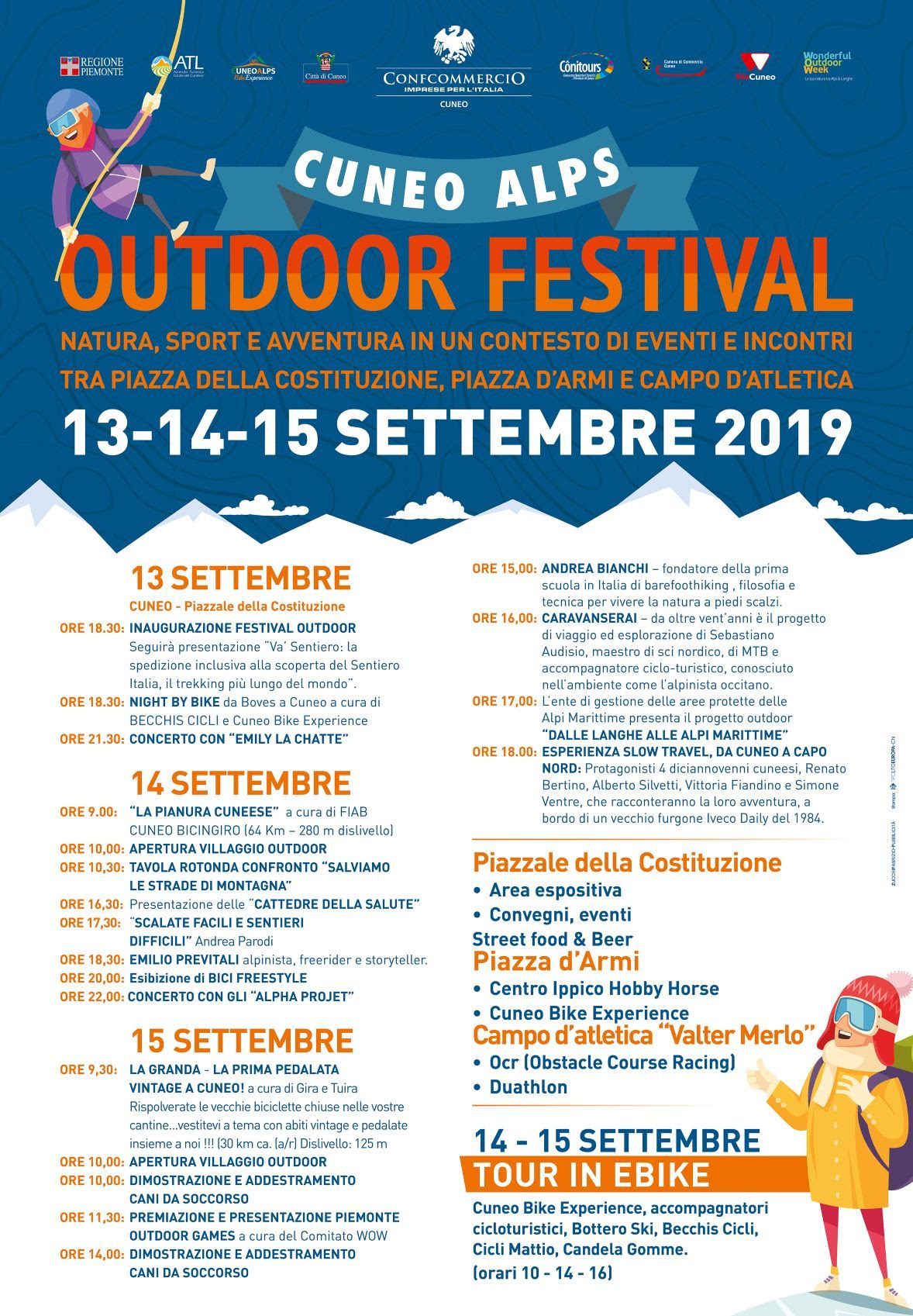 In questa tre giorni di Cuneo Alps Outdoor Festival, che si terrà dal 13 al 15 settembre 2019 tra piazzale della Costituzione, piazza d’Armi, e Campo d’Atletica a Cuneo, protagonista sarà lo sport, declinato principalmente in escursionismo, nordic walking e bike. Molte le iniziative in programma con convegni, attività sportive e racconti di esperienze. All’evento parteciperanno anche alcuni medici dell’Azienda Ospedaliera Santa Croce e Carle, che affronteranno nello specifico il tema dell’alimentazione e forniranno indicazioni relative ai corretti stili di vita.
