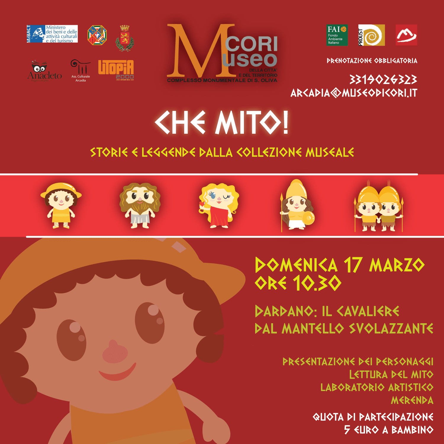 Domenica 17 marzo 2019 dalle ore 10:30 presso il Museo della Città e del Territorio di Cori (Latina), si volgerà l’ultimo appuntamento del ciclo di letture animate e laboratori per le famiglie Che Mito! Storie e leggende dalla collezione museale e dal territorio. Il progetto Dardano, il Cavaliere dal Mantello Svolazzante è ideato e realizzato dall’Associazione culturale Arcadia nell’ambito dei Servizi Educativi del Museo con la collaborazione della Libreria Anacleto di Cisterna di Latina ed Utopia 2000 Società Cooperativa Sociale Onlus, patrocinato dal Comune di Cori. Protagonisti dell’incontro saranno i fondatori mitici dell’antica Cora (tra i quali Dardano) e le copie delle monete coniate nel III secolo a.C. raffiguranti al rovescio un cavaliere all’assalto con lancia, corta spada, mantello e petaso, in cui è presente la scritta Corano, probabilmente la figura simboleggia il fondatore mitico della città.