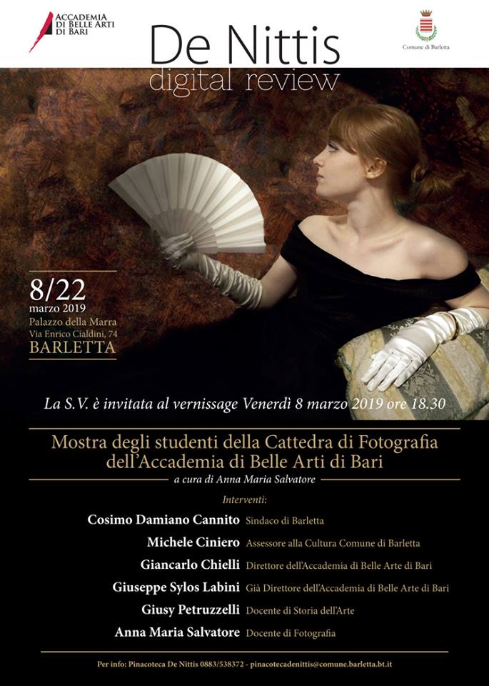 Venerdì 8 marzo 2019 presso Palazzo Della Marra a Barletta si inaugura l’esposizione De Nittis Digital Review, evento patrocinato dall’Accademia di Belle Arti di Bari e dal Comune di Barletta. Nella mostra, che durerà fino a domenica 28 aprile 2019, saranno esposte le fotografie realizzate dagli studenti che hanno liberamente ricreato con la macchina fotografica i dipinti di Giuseppe De Nittis. L’esposizione è infatti frutto di un progetto didattico dell’Accademia di Belle Arti di Bari svolto nell’anno accademico 2017-2018 dalla cattedra di Fotografia della prof.ssa Anna Maria Salvatore: gli studenti dopo aver esaminato le opere di De Nittis hanno realizzato dei set con persone e oggetti in ambienti interni ed esterni, reinterpretando i dipinti e fotografando i set in digitale.