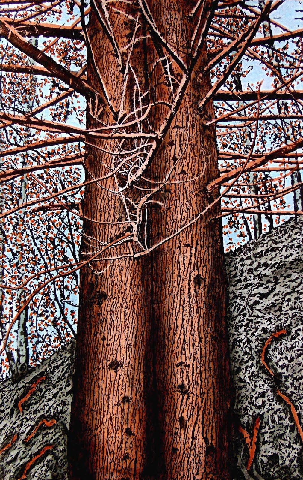 Il Respiro della Natura trae l’ispirazione dal bisogno dell’artista di una più profonda comunione con la natura. In mostra dieci lavori di dimensioni medio-grandi, realizzati negli ultimi tre anni. L’artista rielabora e “ritrae” immagini di tronchi d’alberi, folti arbusti spinosi, piante del sottobosco, quasi ricercando nelle forme e nei dettagli vegetali la fisionomia della Natura. Tinnirello sul disegno amplificato del reale dipinge una leggera velatura con i colori acrilici diluiti, come se fosse acquerello e poi, sopra, altre velature aiutano a compattare il colore e quindi il carboncino per ridisegnare e sottolineare la forma, per creare le ombre e svelare i pieni e i vuoti. Il risultato è decisamente grafico, richiama il processo serigrafico, così da non riuscire più a vedere l’aspetto esteriore della forma ma riconoscerne piuttosto la proiezione immaginifica, pittorica nel senso più profondo del termine, quindi assolutamente artificiale.