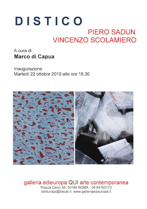 Si inaugura martedì 22 ottobre 2019 alle ore 18:30 presso la Galleria Edieuropa di Roma, la mostra DISTICO – Piero Sadun Vincenzo Scolamiero a cura di Marco Di Capua, che sarà visitabile fino al 30 novembre 2019.
