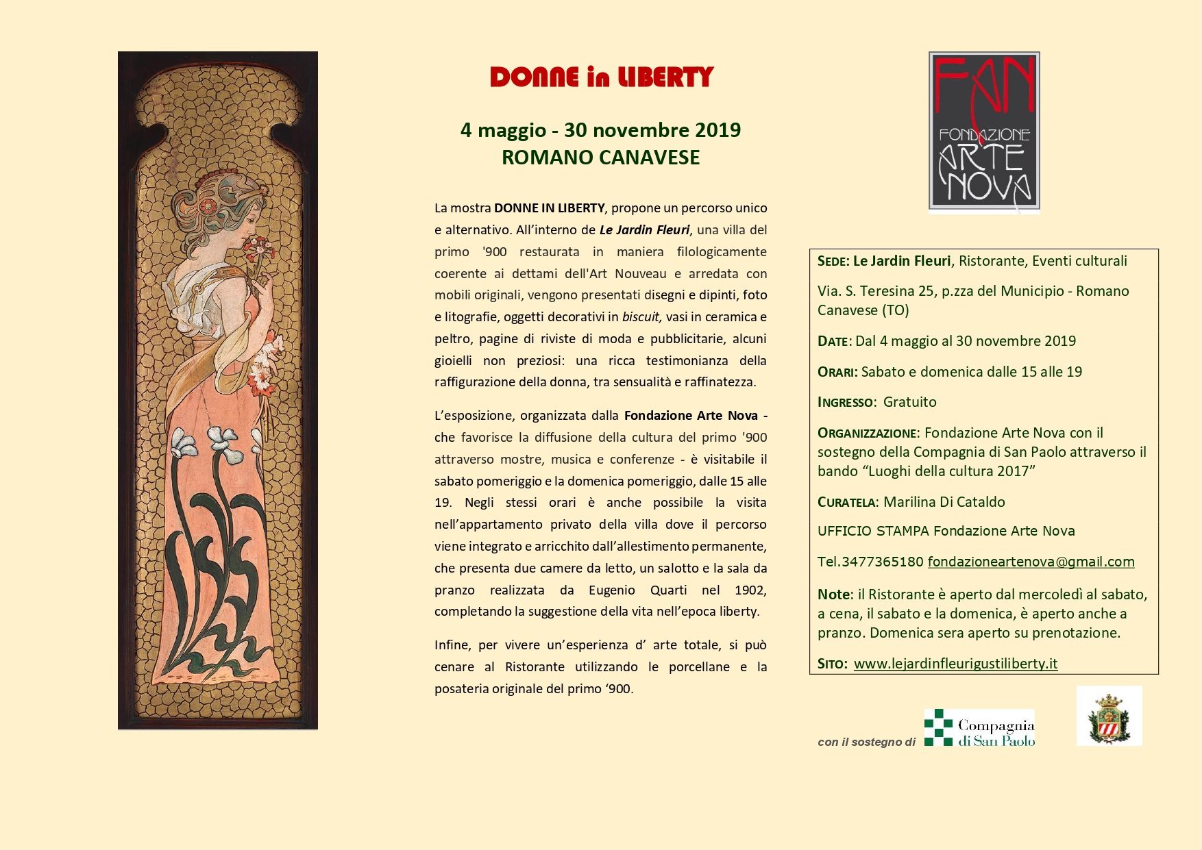 Da sabato 4 maggio a sabato 30 novembre 2019 le bellissime sale della villa liberty Le Jardin Fleuri di Romano Canavese (Torino) ospiteranno la mostra “Donne in Liberty”. L’esposizione propone un percorso unico e alternativo in cui vengono presentati disegni e dipinti, foto e litografie, oggetti decorativi in biscuit, vasi in ceramica e peltro, pagine di riviste di moda e pubblicitarie, alcuni gioielli non preziosi: una ricca testimonianza della raffigurazione della donna, tra sensualità e raffinatezza. La mostra è integrata e arricchita dall’allestimento permanente che presenta due camere da letto, un salotto e la sala da pranzo progettata da Eugenio Quarti nel 1902, completando la suggestione della vita nell’epoca liberty. Durante il periodo della mostra saranno organizzati alcuni incontri sui cambiamenti che hanno accompagnato l’immagine femminile nel primo ‘900. Accanto alla “femme fatale”, soggetto principale delle nuove istanze artistiche che si riuniscono intorno all’Art Nouveau, si parlerà anche dell’importante ruolo sociale della donna.