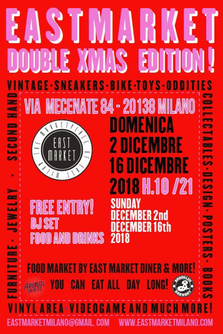 L’edizione natalizia di East Market si fa in due: il mercatino vintage milanese gratuito dedicato alla vendita, allo scambio e all’acquisto sarà aperto domenica 2 e domenica 16 dicembre per lo speciale periodo natalizio. Tantissime idee regalo e gli oggetti più originali per un Natale nel segno del vintage: oltre 300 espositori, scelti tra collezionisti di modernariato e vintage, artigiani, artisti, grafici e designer da tutta Italia, tutti rigorosamente selezionati dallo staff di East Market. Le categorie merceologiche presenti sono prevalentemente vintage, collezionismo, modernariato, usato, pulci, design e artigianato. Gli oggetti più frequenti: abbigliamento e accessori, scarpe e borse, cd e dischi, mobili e complementi d’arredo, libri, fumetti, poster, riviste e stampe, elettronica, militaria, giochi e videogiochi, artigianato, riciclo e riuso, stranezze varie, piatti, porcellane e utensili e molto altro ancora.
