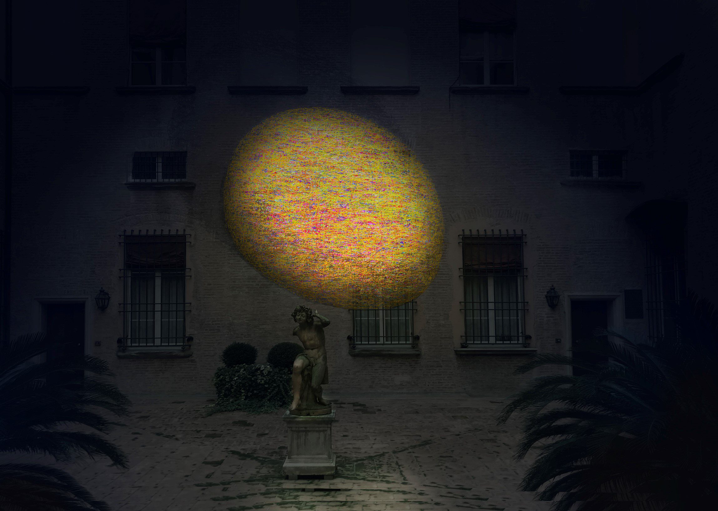 Nel suggestivo cortile rinascimentale di Palazzo Zambeccari sarà allestita l’opera inedita site-specific EosEco (Nulla esiste senza ombra), che dà il titolo all’intero evento e che consiste in una grande scultura sferoidale incentrata sul tema della luce, riprendendo le fila della sperimentazione sui materiali, diventata ormai cifra stilistica di Bevignani. Utilizzando, infatti, un intreccio di fili di nylon e il silicone pigmentato con colori fosforescenti sulla gamma dei gialli cadmio, l’artista sperimenta una inusuale scultura gonfiabile, in cui la texture del rivestimento appare piena di protuberanze, di rilievi e di villi simil-organici che catturano e rifrangono la luce, mostrandosi come una grande goccia luminescente. Come afferma lo stesso artista nell’intervista fattagli dalla curatrice Silvia Grandi “la materia è ricettacolo di luce; colpita da essa rivela ai nostri recettori tutti i colori del suo complesso ventaglio plastico. Ho scelto la forma sferoidale, propria dei semi, perché più capiente con una minore superficie, come avviene per le gocce d’acqua”.