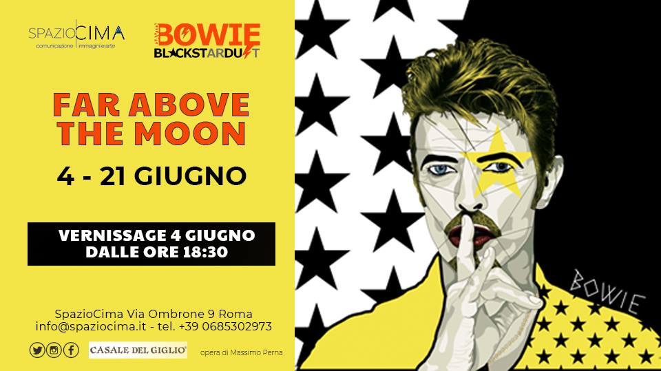 FAR ABOVE THE MOON è il nome della nuova mostra di SpazioCima a Roma che inaugurerà martedì 4 giugno e proseguirà sino a venerdì 21 giugno 2019. Organizzata da Roberta Cima e Pietro Galluzzi, la collettiva è dedicata a David Bowie. Tra gli artisti che hanno già confermato il loro omaggio con le loro opere e i loro stili ci sono Eugenio Rattà, Nino Attinà, Chiara Montenero, Cristina Taverna, Cristina Davoli, Valerio Prugnola, Paola Lomuscio, Marco Giacobbe, Mokodu Fall, Giovanni Sechi, Barbara Lo Faro, Adriana Farina, Valentina Lo Faro, Antonella Torquati, Rosalba Ruggero, Gabriella Annik, Tuono Pettinato, Daniela Durisotto. Circa trenta le opere e le installazioni in esposizione, di vari formati. Una mostra incentrata proprio sul rapporto tra il cantante e lo spazio, che in varie occasioni è stato approfondito.