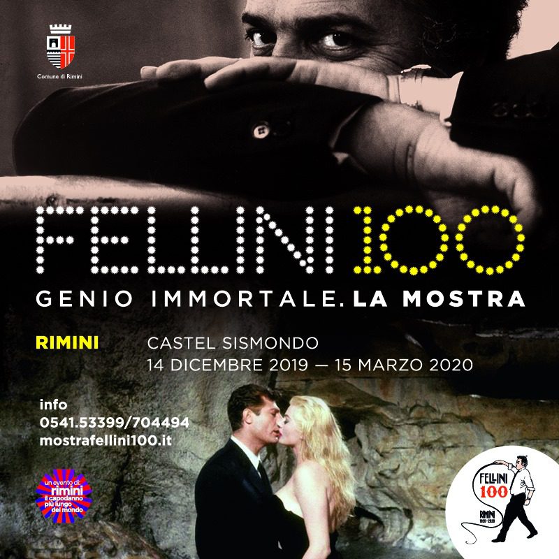 A 100 anni dalla nascita del Maestro del cinema Federico Fellini la città di Rimini si prepara a celebrarlo per un intero anno con una serie di iniziative che partono il 14 dicembre 2019 con l’inaugurazione di una grande mostra nelle sale di Castel Sismondo. L’esposizione Fellini 100. Genio Immortale è progettata da Studio Azzurro di Milano ed è curata da Marco Bertozzi e Anna Villari. L’esposizione si sviluppa attraverso quattordici sale e si caratterizza per un allestimento scenografico innovativo: ogni sala tende a prendere l’aspetto di un set cinematografico con una particolare caratterizzazione multimediale e dalle connotazioni di forte “messa in scena” in modo che il pubblico più che di fronte ad una serie di informazioni visive e testuali possa trovarsi avvolto da esse. Tre i nuclei di contenuti: la storia d’Italia a partire dagli anni Venti-Trenta per passare poi al dopoguerra e finire agli anni Ottanta attraverso l’immaginario dei film di Fellini, il racconto dei compagni di viaggio del regista – reali, immaginari, collaboratori – e la presentazione del progetto permanente del Museo Internazionale Federico Fellini. Il materiale originale in mostra è costituito da film, disegni, costumi, documenti, manoscritti e fotografie proveniente dal patrimonio accumulato negli anni dell’ex Fondazione Fellini – ora proprietà del Comune di Rimini – e da fondazioni, archivi pubblici e collezioni private con i quali il Comune di Rimini ha collaborato in passato e che forniscono il materiale in loro possesso, in alcuni casi ancora inedito. Una sezione presenterà ad esempio il materiale del Fondo Nino Rota, il celebre compositore che ha collaborato con Fellini su molti film mentre dal set di Casanova sarà in mostra il ciak originale, in prestito della Fondazione Fellini di Sion con la quale il Comune di Rimini ha siglato un protocollo di intesa. Altri prestiti sono provenienti dall’archivio fotografico di Elisabetta Catalano e dalle collezioni private dei maestri della fotografia Tonino Delli Colli e Giuseppe Rotunno mentre dall’archivio dell’Associazione Tonino Guerra ci saranno materiali inediti appartenuti al poeta, scrittore e sceneggiatore nato anche lui nel 1920 come l’amico Fellini. La mostra resterà allestita a Rimini fino al 15 marzo 2020 per poi cominciare il suo viaggio e arriverà a Roma il prossimo aprile 2020 a Palazzo Venezia, per poi varcare i confini nazionali con esposizioni a Los Angeles, Mosca e Berlino.