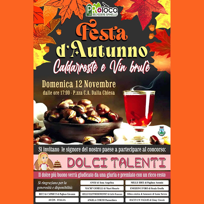 Domenica 12 novembre dalle ore 17 in piazza Carlo Alberto Dalla Chiesa a Belvedere Spinello si celebra la stagione con la Festa d’Autunno e le tradizionali caldarroste, il vin brulé e la dolcissima competizione “Dolci Talenti” che premierà il dolce più buono!