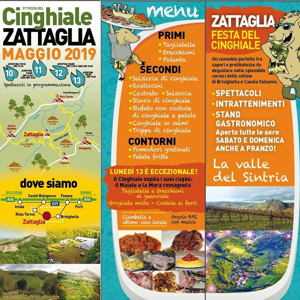 Dal 10 al 13 maggio 2019 musica, allegria e ottimi piatti della tradizione locale attendono i visitatori in provincia di Ravenna con la Festa del Cinghiale di Zattaglia. L’evento, ospitato nel panorama mozzafiato del parco regionale della vena del gesso romagnola, quest’anno compie 31 anni e proporrà come sempre un connubio perfetto tra sapori, prelibatezze da degustare ed autenticità. La piccola borgata di Zattaglia si trova ai piedi di Monte Mauro (Vena del Gesso) tra le colline di Brisighella e Casola Valsenio ed accoglierà per quattro giorni gli amanti dal gusto rustico di questa carne prelibata che da nome alla festa, grazie all’impegno del GRUPPO SPORTIVO VALSINTRIA e dei suoi volontari che hanno mantenuto una crescita di livello in tutte queste edizioni, sia di presenze che di esperienze.