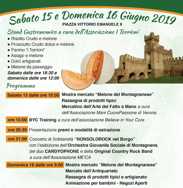 Sabato 15 e domenica 16 giugno 2019 a Montagnana (Padova) si svolgerà la decima edizione della Festa del Melone del Montagnanese, grande mostra-mercato con stand e degustazioni a tema, rassegne di artigianato e prodotti tipici e attività di animazione per bambini. Il programma dell’evento, ospitato in piazza Vittorio Emanuele II, prevede anche un concerto di solidarietà dal titolo NONSOLOROCK nel borgo, negozi aperti e mostre di antiquariato. Numerose le specialità gastronomiche che verranno offerte a cittadini e turisti, dal tradizionale risotto crudo e melone ai dolci artigianali al panino tipico “I Torrioni”.