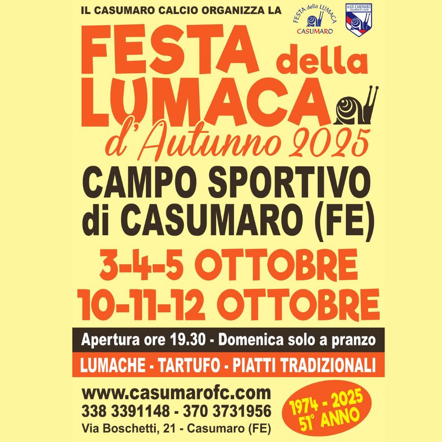 Dal 3 al 5 e dal 10 al 12 ottobre torna la FESTA della LUMACA al CAMPO SPORTIVO di Casumaro!