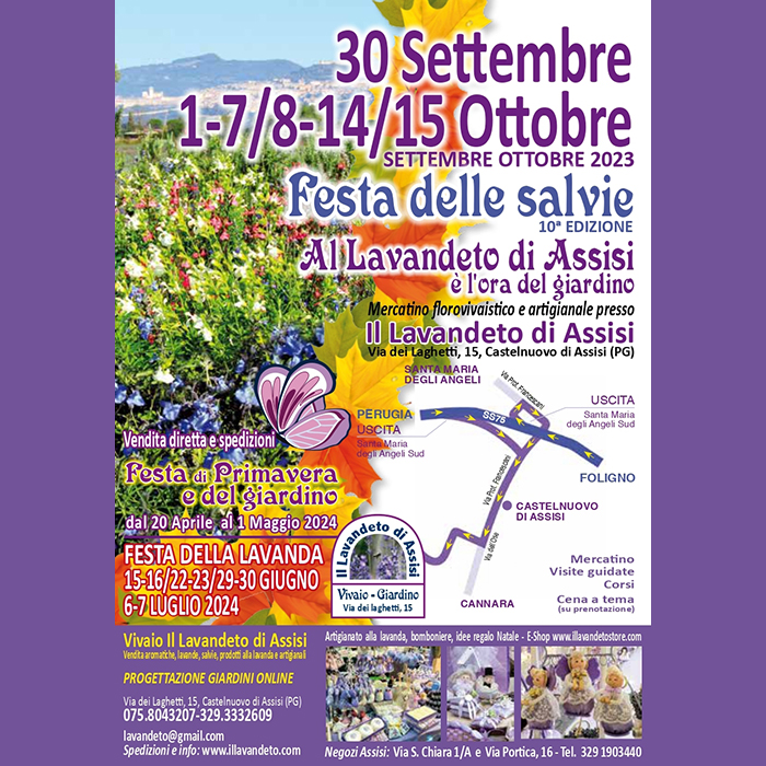 Non perdere l’occasione di scoprire le bellissime SALVIE DA FIORE! Queste meravigliose piante perenni, fioriscono da aprile a novembre e sono di mille colori! Ideali per qualsiasi tipo di giardino e terrazzo, amano il sole e richiedono pochissime cure. Alla Festa delle Salvie troverai anche tantissime varietà di piante rare: lavande, ninfee, piante aromatiche, piante erbacee perenni, ed lo stand di artigianato alla lavanda con moltissimi prodotti naturali.